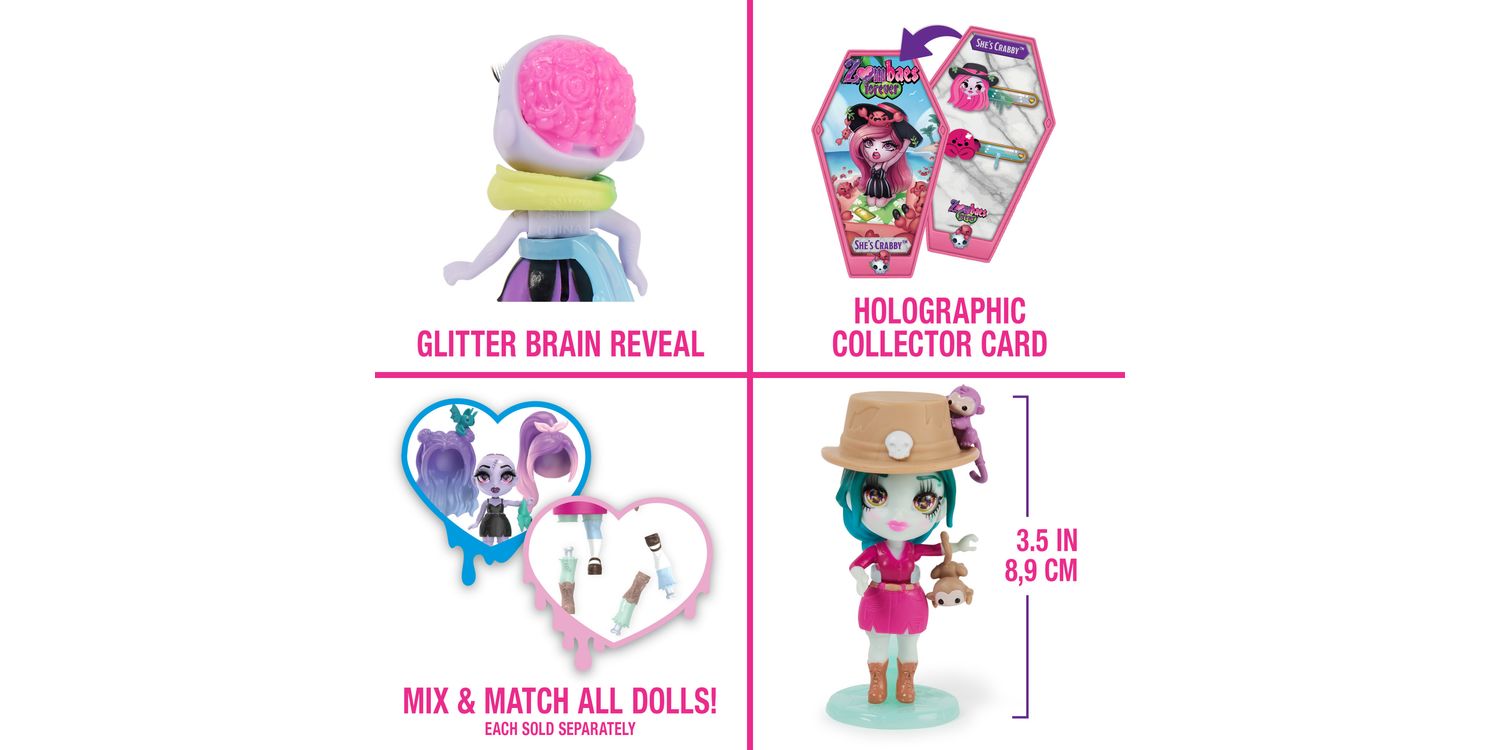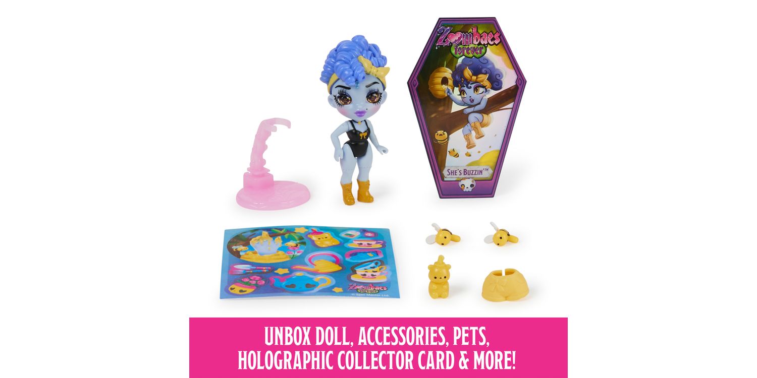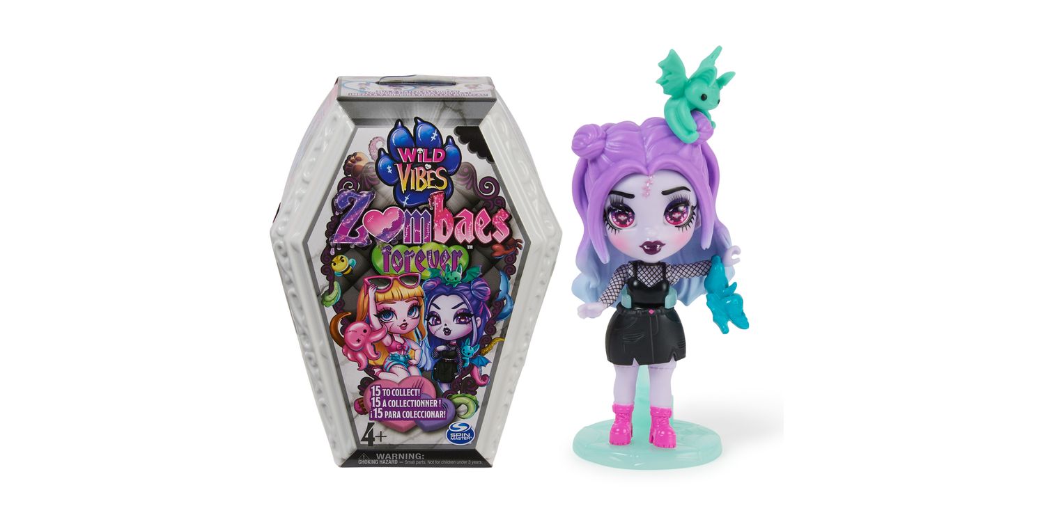 Wild Vibes Zombaes Forever zombie dolls have arrived from the glamyard. These fashionable small dolls feature gorgeous details, humorous names, adorable critter friends and a unique un-coffin-ing unboxing. Pull the tab on the surprise box to reveal the coffin and open it to find your 8.9-cm Zombaes Forever surprise doll. Will you get the rare space ghoul, Spacing Out? In the coffin, you’ll also get 1–2 accessories, 1–2 pets, a sticker sheet, a spinal-cord doll stand and a holographic collector card. After un-coffin-ing, mix and match your character’s hair and legs with any of the Zombaes Forever toys to create new looks — you can even swap their pets. For more surprises, when you lift her hair, you’ll uncover her glittery brain, with one of four designs on it. Each character has a witty name inspired by her unlucky demise. Collect edgy party girl Keep the Party Alive, with her bats; beach girl So Clingy, with an octopus; She’s Buzzin’, with honey and bees; safari-themed Hanging Around, with monkeys; and more. Decorate the coffin with the stickers and display your zombie doll in or out of her coffin. Place the collector card on the coffin’s lid — the exclusive artwork tells her story. With their zombie-chic details, super-cute pets and mix-and-match hair and legs, these girls’ toys are the perfect small toys for pretend play. Un-coffin all 15 Wild Vibes Zombaes Forever zombie toys and look for the Deluxe Sets and Abandoned Pet Shop doll house playset (mini dolls and sets each sold separately). Zombaes Forever surprise toys for girls are great gifts for 4-year-old girls and up. Bring home the Zombaes Forever Wild Vibes dolls and live your best afterlife. SURPRISE COLLECTIBLE DOLL: Each drop-dead gorgeous Zombaes Forever Wild Vibes doll includes a coffin, 1–2 doll accessories, 1–2 clingy pet friends, stickers, a spinal-cord stand and a holographic collector card UNIQUE UN-COFFIN-ING: These 8.9-cm dolls for girls have an exciting unboxing. Pull the tab on the surprise box to find her coffin and open it to reveal your small zombie doll. Will you find the rare one? MIX-N-MATCH LOOKS: Perfect for pretend play, swap your character’s pets or hair and legs with another doll to switch up her look. Lift her hair and discover 1 of 4 designs on her glitter brain 15 DOLLS TO COLLECT: Un-coffin all 15 Zombaes Forever Wild Vibes girls’ toys (each sold separately), including So Clingy, OverBEARing, Keep the Party Alive, the rare Spacing Out and more SURPRISE TOYS FOR 4-YEAR-OLD GIRLS AND UP: These zombie dolls and accessories are great birthday gifts, stocking fillers or special occasion gifts for kids. Perfect toys for Halloween Includes: 1 Zombaes Forever Doll, 1–2 Zombaes Forever Pets, 1–2 Accessories, 1 Doll Stand, 1 Sticker Sheet, 1 Trading Card, 1 Collector Sheet