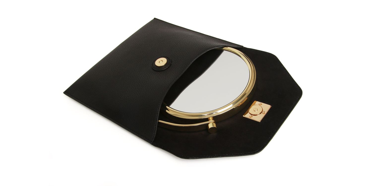 This gold mirror has two sides, one with 1x magnification and one with 7x magnification, so you can easily apply your makeup and style your hair. It folds flat and slips into luxury its pouch, which is adorned with our famous Honeybee Logo. You can pick from a range of colours to suit your taste. This mirror is the ideal partner for your beauty routine, whether you’re at home or on the move