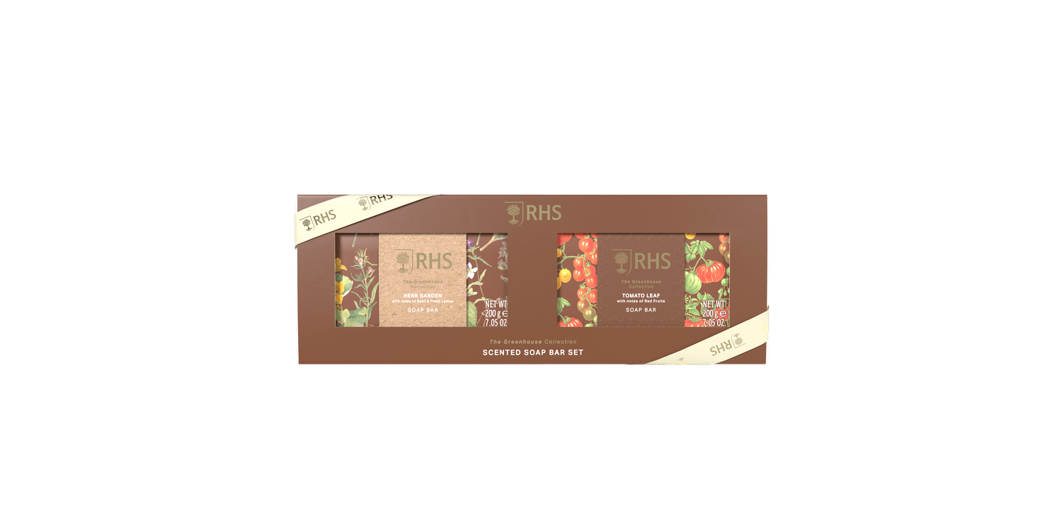 This RHS Soap Bar Gift Set includes two 200g soap bars, each inspired by the fresh scents of the garden. One Tomato Leaf with crisp, green notes, and one Herb Garden with aromatic herbal tones. Created in collaboration with the Royal Horticultural Society, the set offers a rich lather, long-lasting fragrance, and botanical packaging, perfect for gifting or everyday use.