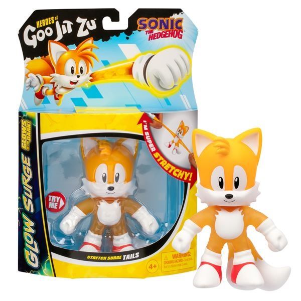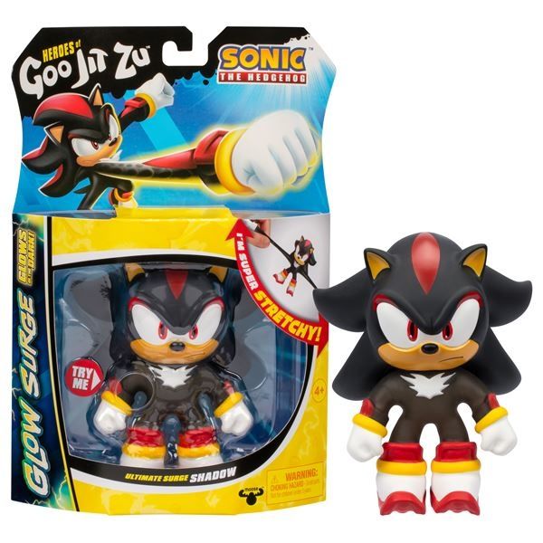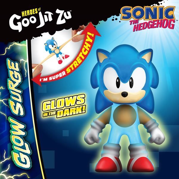 Heroes of Goo Jit Zu Sonic the Hedgehog is back with his former rival and now best friend, Knuckles alongside Shadow and Tails! They're not just supersonic and super stretchy, now they're powered up with Glow Surge to become Speed Surge Sonic and Unstoppable Surge Knuckles, Tails and Shadow with Glow-in-the-Dark powers! Sonic, Knuckles Shadow and Tails have jumped out of the screen and into your hands to become super stretchy! Squeeze, stretch and play with them like never before! Grab them by their limbs and stretch out their arms and legs. Wow! They can stretch up to 3 times their size (their arms can stretch up to 16-Inches / 40cm)! Let them go and watch them return to their original shape and size! Heroes of Goo Jit Zu are the new gooey, stretchy way to play with your favourite toy characters - with no mess. Discover a new Glow-in-the-Dark way to play and help Speed Surge Sonic, Unstoppable Surge Knuckles, Shadow and Tails save the day!
