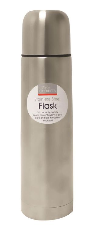 1 litre capacity, stainless steel flask. Ideal for keeping contents hot or cold.