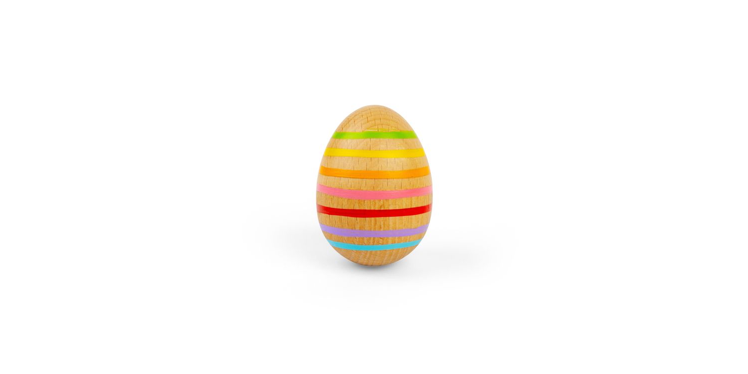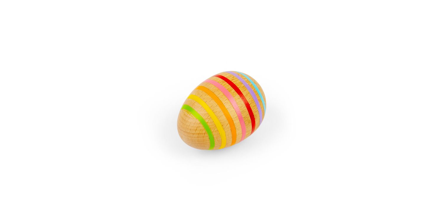 Shake things up with this cute wooden Egg Shaker! Designed with a smooth natural wood finish and vivid rainbow stripes, this mini percussion toy is perfectly sized for small hands to grasp, wiggle, and shake. Listening to the soft rattle sound will also help to calm and soothe young ones.