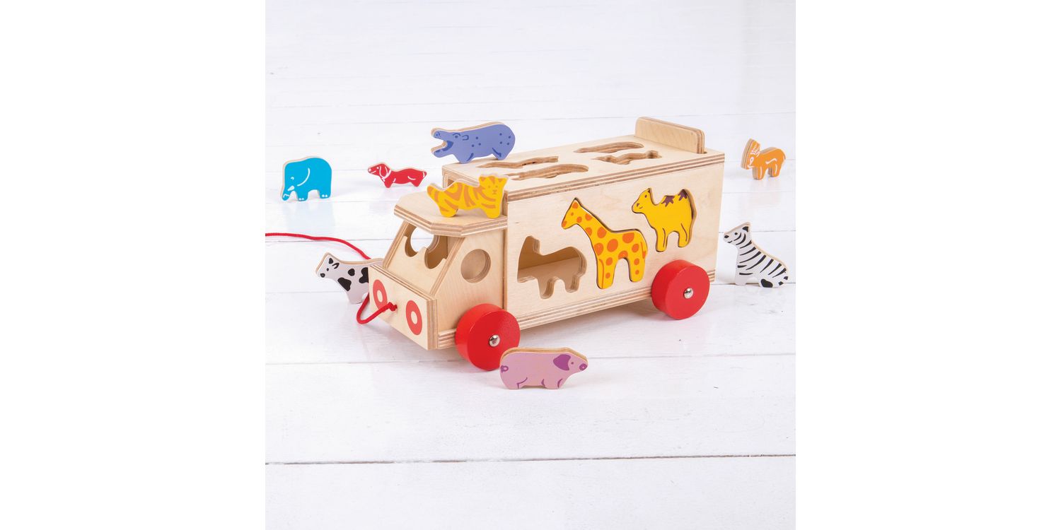 This brightly coloured pull-along wooden shape sorter comes packed with 10 vibrant wooden animals.
